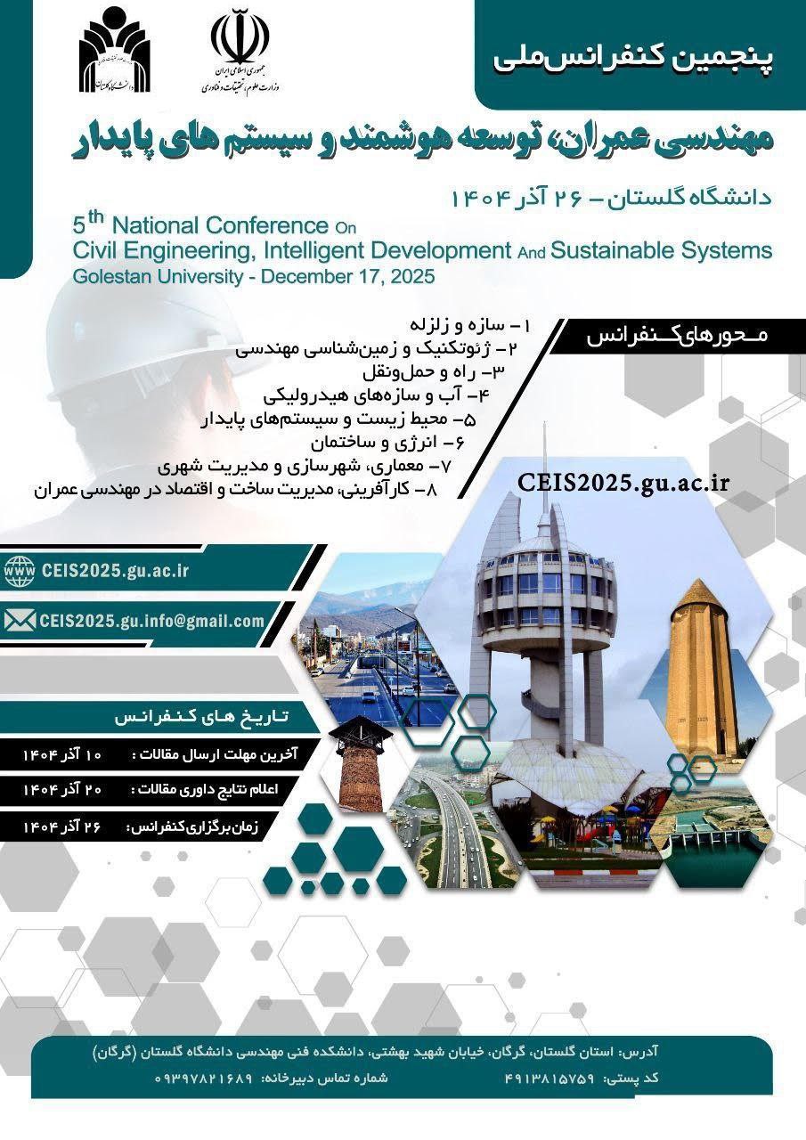 📢 پنجمین کنفرانس ملی مهندسی عمران؛ توسعه هوشمند و سیستمهای پایدار 🏛 به میزبانی دانشگاه گلستان – گرگان 📅 تاریخ برگزاری: ۲۶ آذر ۱۴۰۴ (December 17, 2025) 📝 آخرین مهلت ارسال مقالات: ۱۰ آذر ۱۴۰۴ 📣 اعلام نتایج داوری: ۲۰ آذر ۱۴۰۴ 🔍 محورهای کنفرانس: 1. سازه و زلزله 2. ژئوتکنیک و زمینشناسی مهندسی 3. راه و حملونقل 4. آب و سازههای هیدرولیکی 5. محیط زیست و سیستمهای پایدار 6. انرژی و ساختمان 7. معماری، شهرسازی و مدیریت شهری 8. کارآفرینی، مدیریت ساخت و اقتصاد در مهندسی عمران 📍 مکان برگزاری: استان گلستان، گرگان، خیابان شهید بهشتی، دانشکده فنی مهندسی دانشگاه گلستان
